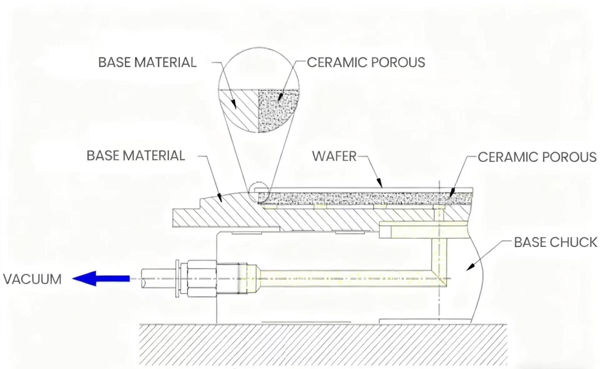 Prilagojenoporozna keramična vpenjalna glavasestavljen iz baze in porozne keramične plošče. S povezavo z vakuumskim sistemom se nizkotlačno okolje ustvari z odvajanjem zraka med rezino in keramiko. Pod vakuumskim podtlakom se rezina trdno prilepi na površino vpenjalne glave, s čimer se na koncu doseže varna in stabilna fiksacija in pozicioniranje.