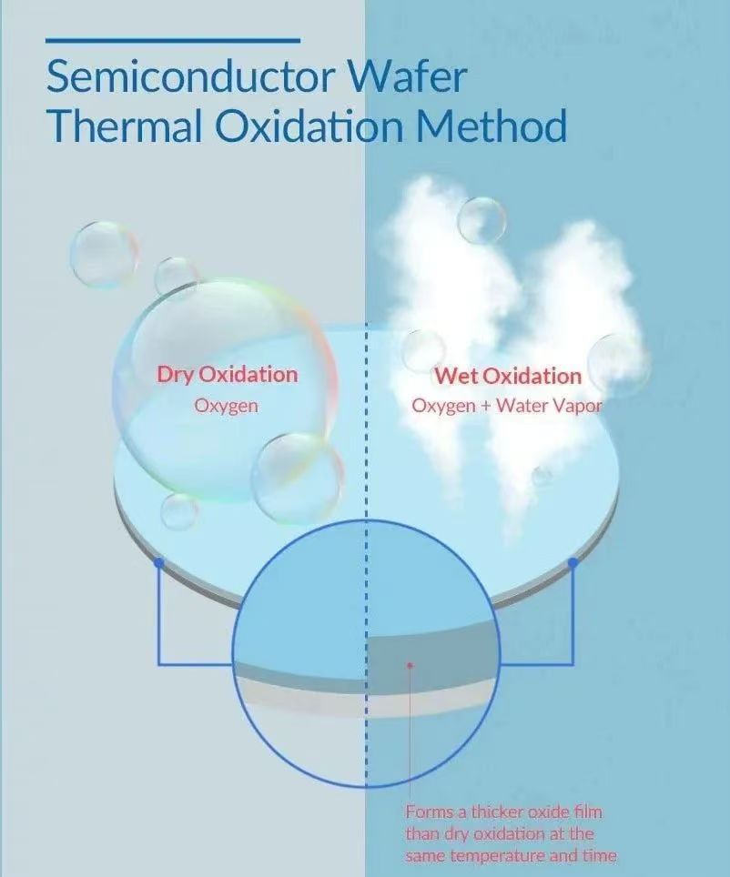 V postopku suhe oksidacije so rezine za oksidacijo izpostavljene visokotemperaturnemu okolju, obogatenemu s čistim O₂. Suha oksidacija poteka počasi, ker so molekule kisika težje od molekul vode. Vendar pa je ugoden za proizvodnjo tankih, visokokakovostnih oksidnih plasti, ker ta počasnejša hitrost omogoča natančnejši nadzor nad debelino filma. Ta postopek lahko proizvede homogen SiO₂ film z visoko gostoto, ne da bi proizvedel nezaželene stranske produkte, kot je vodik. Primeren je za izdelavo tankih oksidnih plasti v napravah, ki zahtevajo natančen nadzor nad debelino in kakovostjo oksida, kot so oksidi MOSFET vrat.