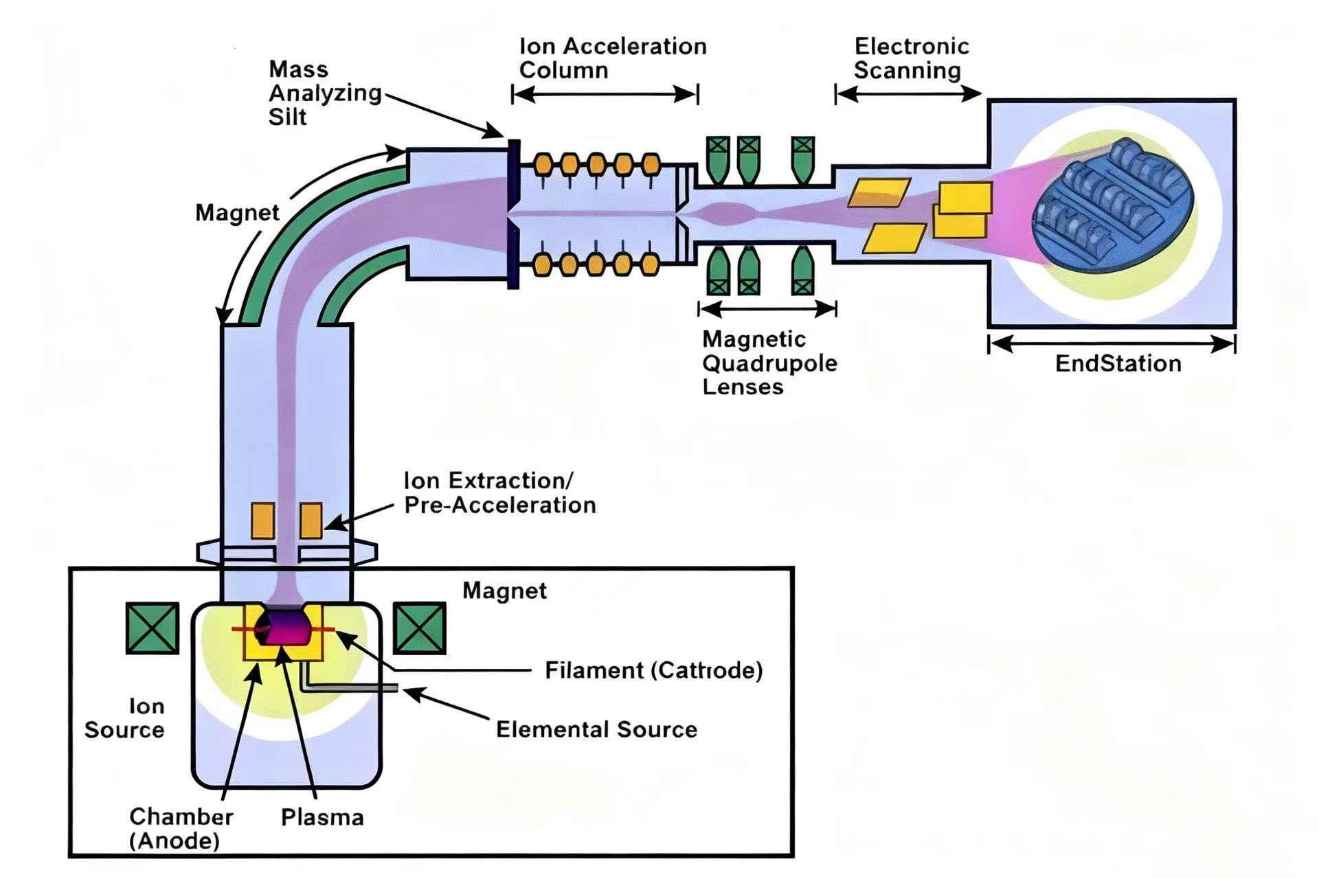 2.Ionska implantacija je primarna tehnika dopiranja v proizvodnji polprevodnikov, ki ima številne prednosti, kot so visoka natančnost dopiranja, nizke procesne temperature in majhna škoda na materialu substrata. Natančneje, postopek ionske implantacije vključuje ioniziranje atomov nečistoč, da se ustvarijo nabiti ioni, nato pospeševanje teh ionov prek visokointenzivnega električnega polja, da se tvori visokoenergijski ionski žarek. Površino polprevodnika nato udarijo ti hitro premikajoči se ioni, kar omogoča natančno implantacijo z nastavljivo globino dopiranja. Ta tehnika je še posebej uporabna za ustvarjanje plitvih spojnih struktur, kot so območja izvora in odtoka MOSFET-jev, in omogoča visoko natančen nadzor nad porazdelitvijo in koncentracijo nečistoč.