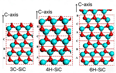 Seveda material SiC ni sestavljen iz enega samega tetraedra z enim atomom Si in enim atomom C, ampak iz neštetih atomov Si in C. Veliko število atomov Si in C tvori valovite dvojne atomske plasti (ena plast atomov C in ena plast atomov Si), številne dvojne atomske plasti pa se zložijo v kristale SiC. Zaradi občasnih sprememb, ki se pojavljajo med procesom zlaganja dvojnih atomskih plasti Si-C, trenutno obstaja več kot 200 različnih kristalnih struktur z različnimi ureditvami. Trenutno so najpogostejše kristalne oblike v praktičnih aplikacijah 3C-SiC, 4H-SiC in 6H-SiC.